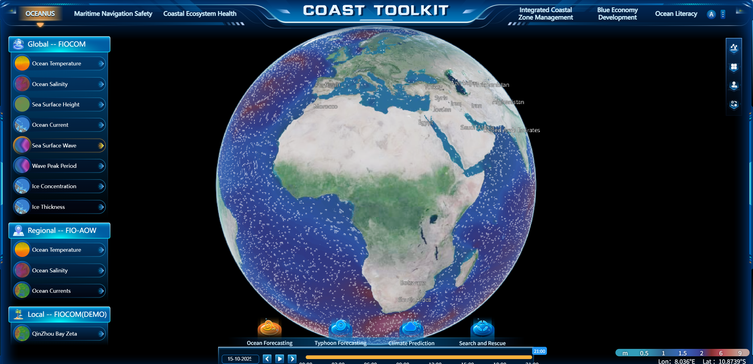 The First Institute of Oceanography, MNR has originally established the wave induced mixing theory and developed the world's first wave current circulation coupled numerical model, which has significantly improved the long-term problems of high simulated sea surface temperature and shallow mixing layer in the marine numerical model. The theory has been applied by many research groups in the United States, Germany, France, Britain, Sweden, Hungary, Australia and other countries, which has significantly improved the simulation and prediction accuracy of its ocean numerical model. Accessible through the website: http://144.123.38.62:2018/#/, and the phone app, Global Ocean on Desk provides five-day forecast products and downloadable archived data of surface wave height, wave direction, wave period, sea level, three-dimensional ocean current, sea temperature and salinit, etc. ![]() |